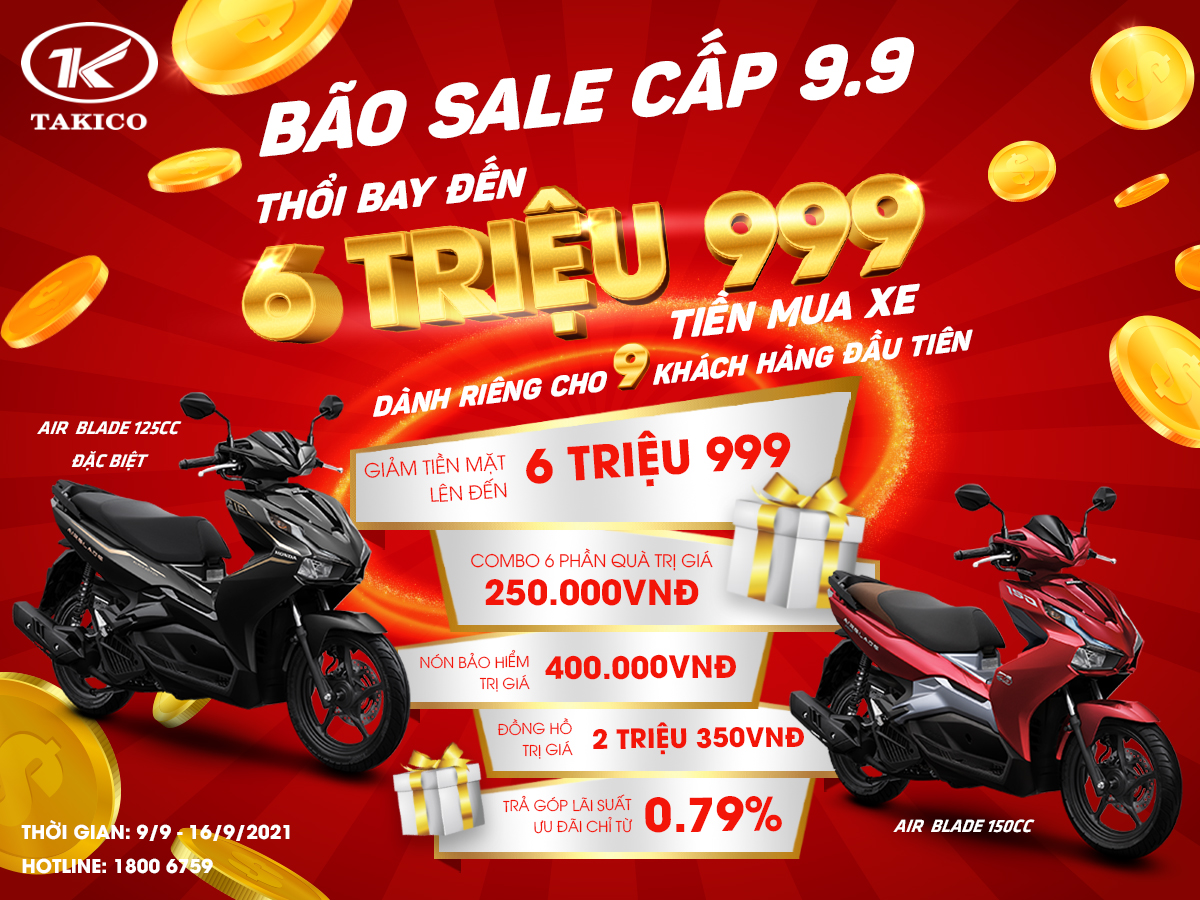 Combo sẽ áp dụng cho 9 khách hàng đầu tiên mua xe Air Blade 150cc và 9 khách mua xe Air Blade 125cc Đặc biệt. Chỉ còn vài giờ đồng hồ “Bão Sale” đổ bộ, cả nhà đã sẵn sàng chưa nào?
