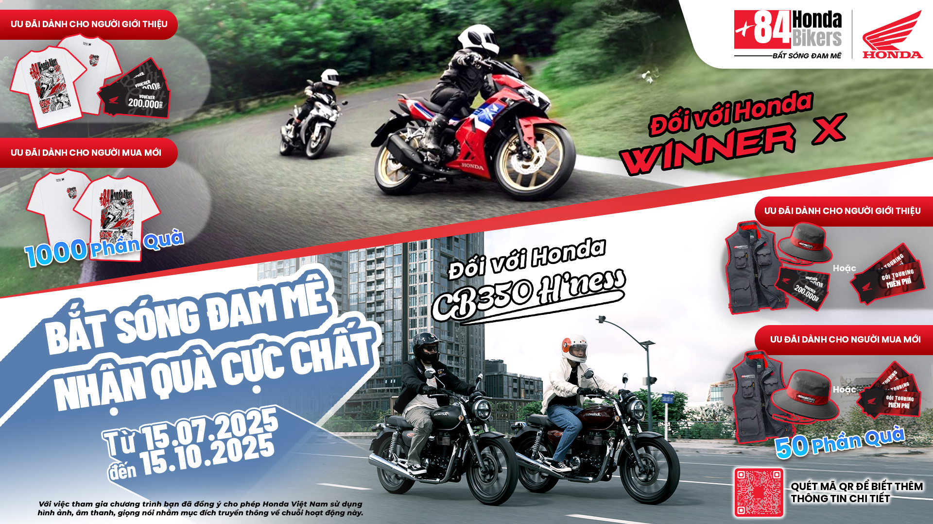Từ 15/07/2025 đến hết 15/10/2025, chỉ cần bạn là thành viên +84 Honda Bikers và giới thiệu bạn bè mua xe Winner X hoặc CB350 H’ness tại Hệ thống HEAD Tân Kiều, cả hai sẽ nhận ngay những phần quà cực chất!